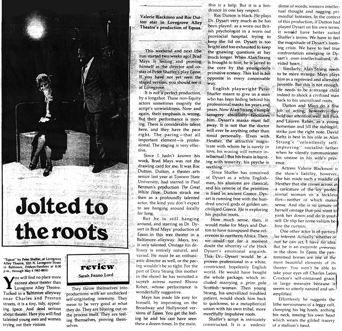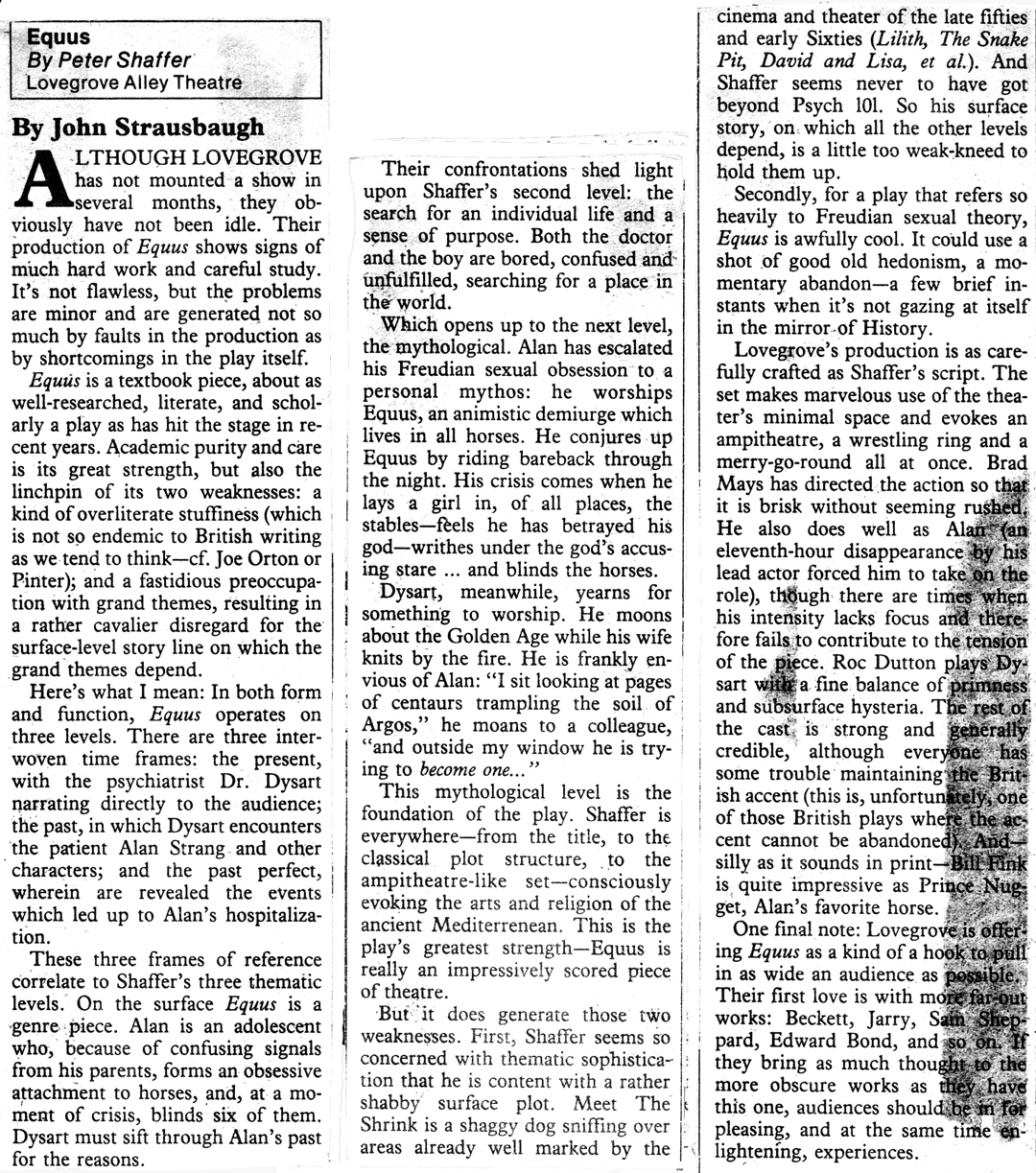 5. Strausbaugh, John (May 10, 1979). “Carefully Crafted ‘Equus’ at Lovegrove Theatre (Review)”. Baltimore City Paper. http://bradmays.com/print/citypaperequusreview.jpg.